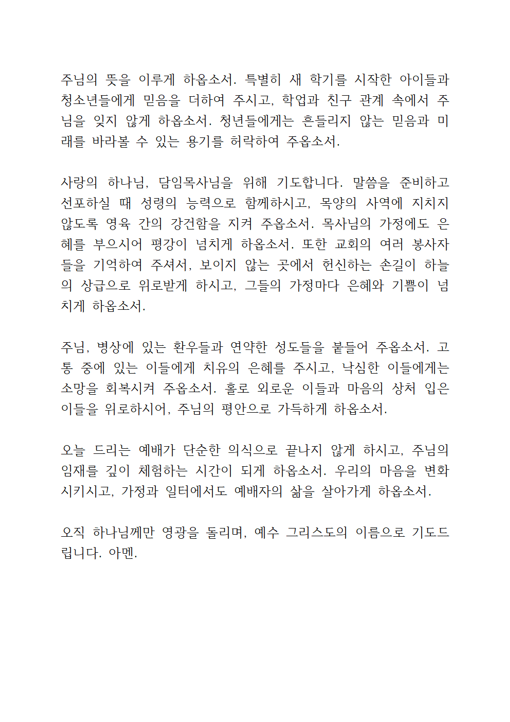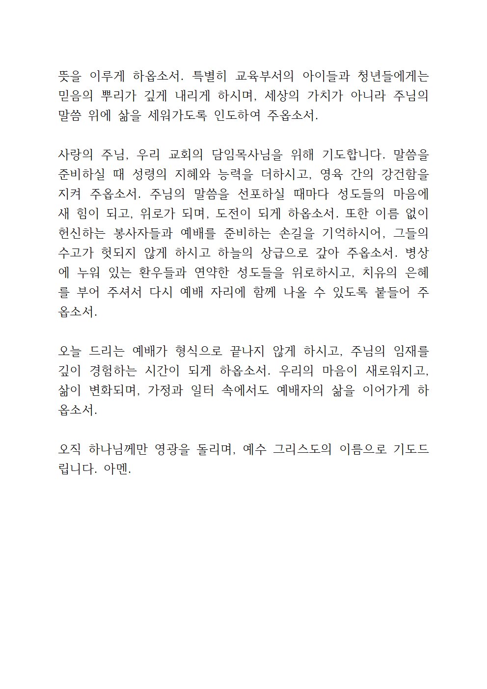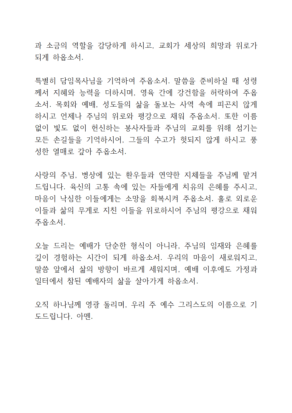 주님, 교회를 주님의 손에 맡깁니다. 이 시대에 흔들림 없는 믿음의 공동체로 세워 주시고, 말씀과 기도로 깨어 있는 교회가 되게 하옵소서. 담임목사님과 모든 사역자들에게 성령의 충만함을 더하시고, 말씀을 선포할 때마다 생명의 능력이 나타나게 하옵소서. 또한 교회를 위해 묵묵히 수고하는 봉사자들을 기억하셔서 그들의 손길이 주님의 기쁨이 되게 하시고, 삶 속에서도 은혜와 평강을 누리게 하옵소서.