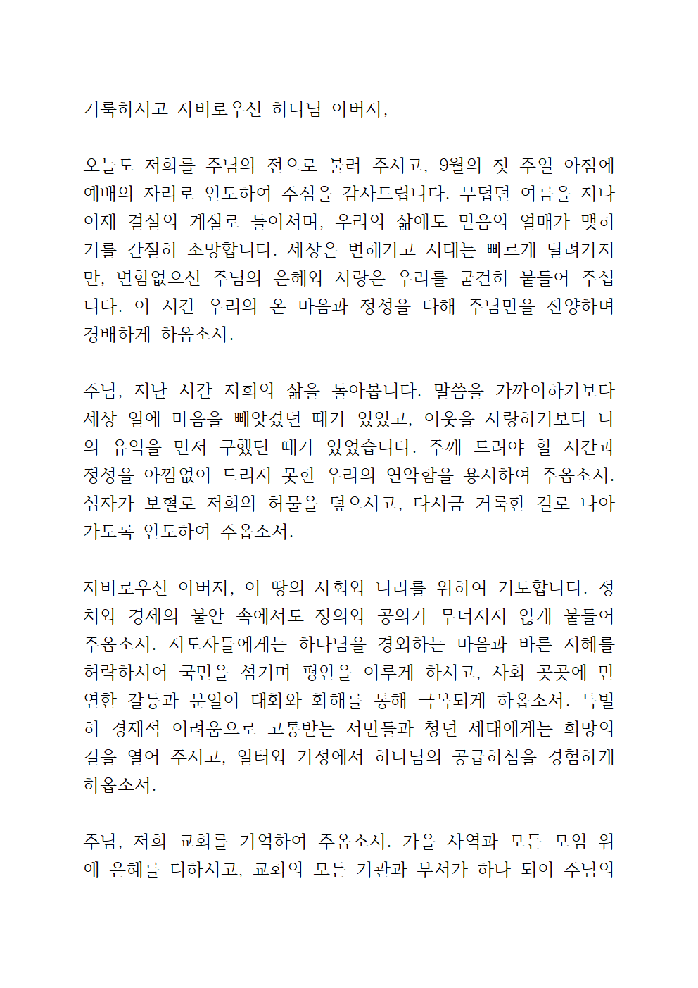 9월 첫째 주일예배 대표기도문