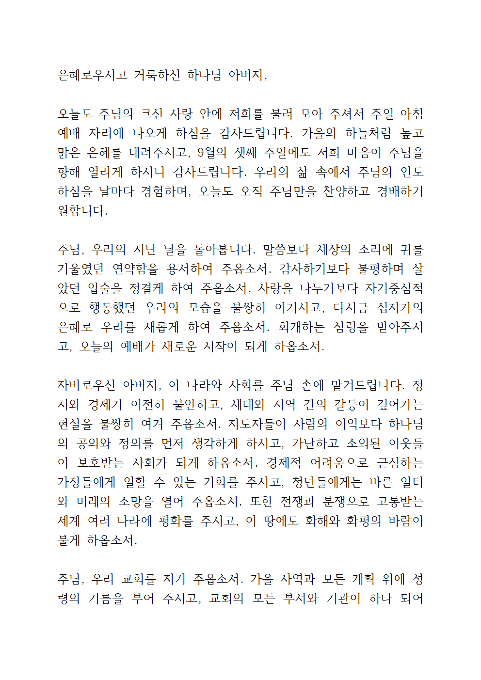 9월 주일예배 대표기도문 본문
