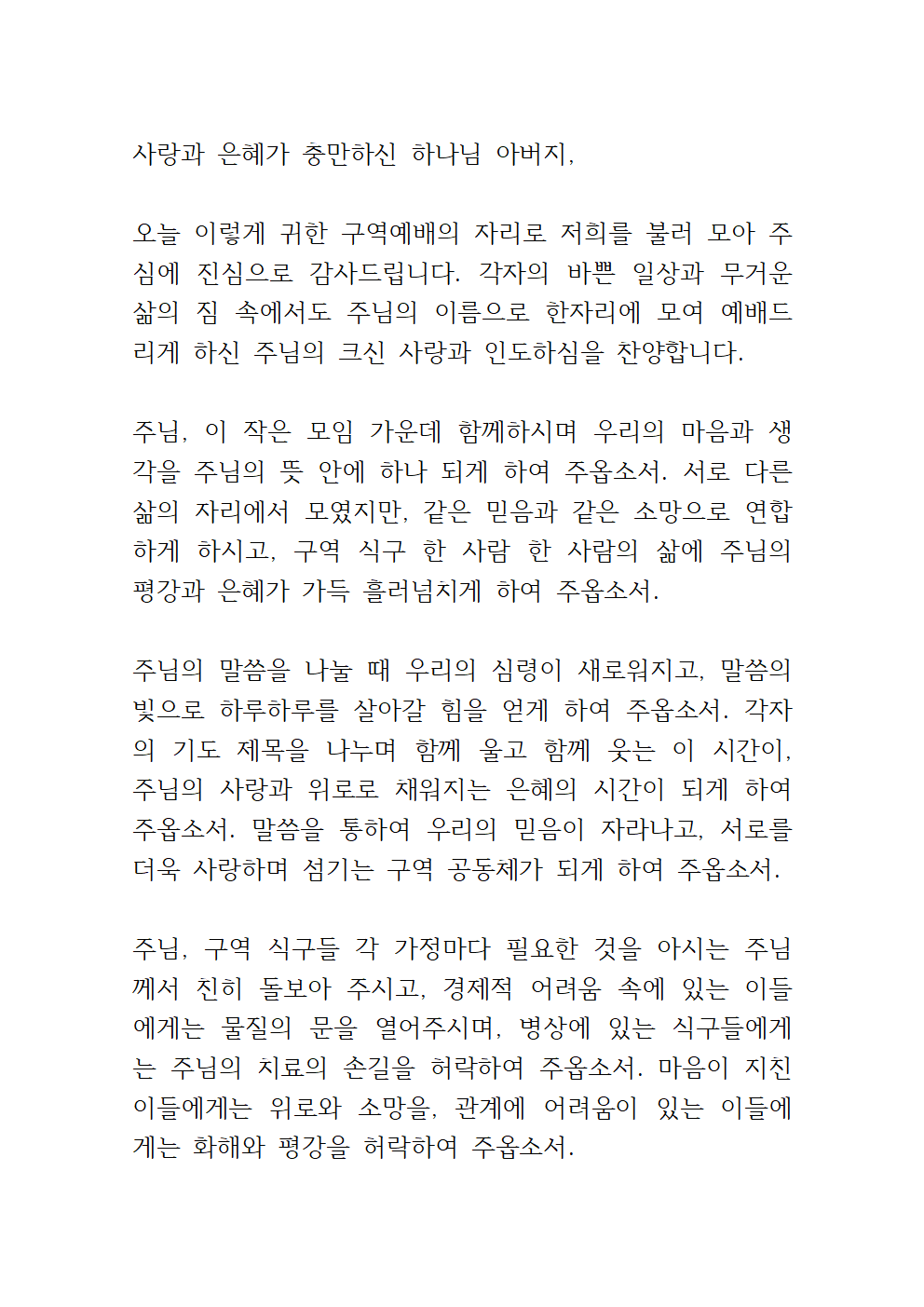 이번 글에서는 구역예배, 목장예배 대표기도문 (hwp 포함)을 안내해 드리겠습니다.