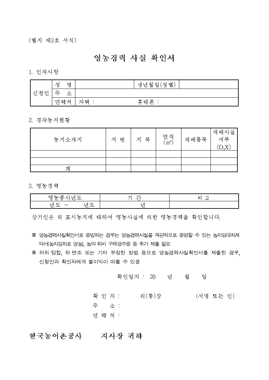 - 양식 작성: 위에서 언급한 신청인 정보와 경작지 정보를 정확하게 기재합니다.