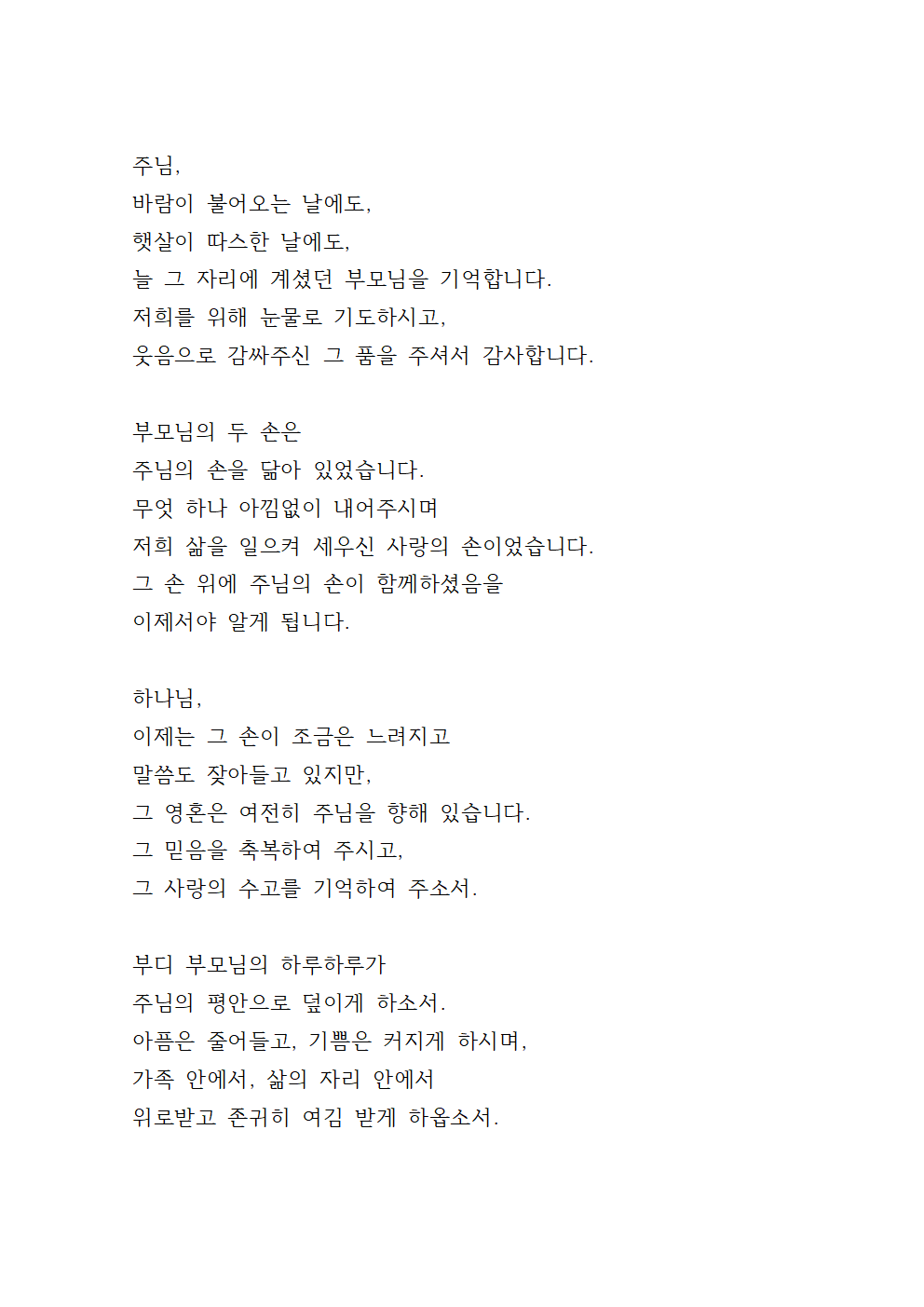 주님, 우리의 부모님들을 기억하시고 주님의 평강으로 채워주시옵소서.