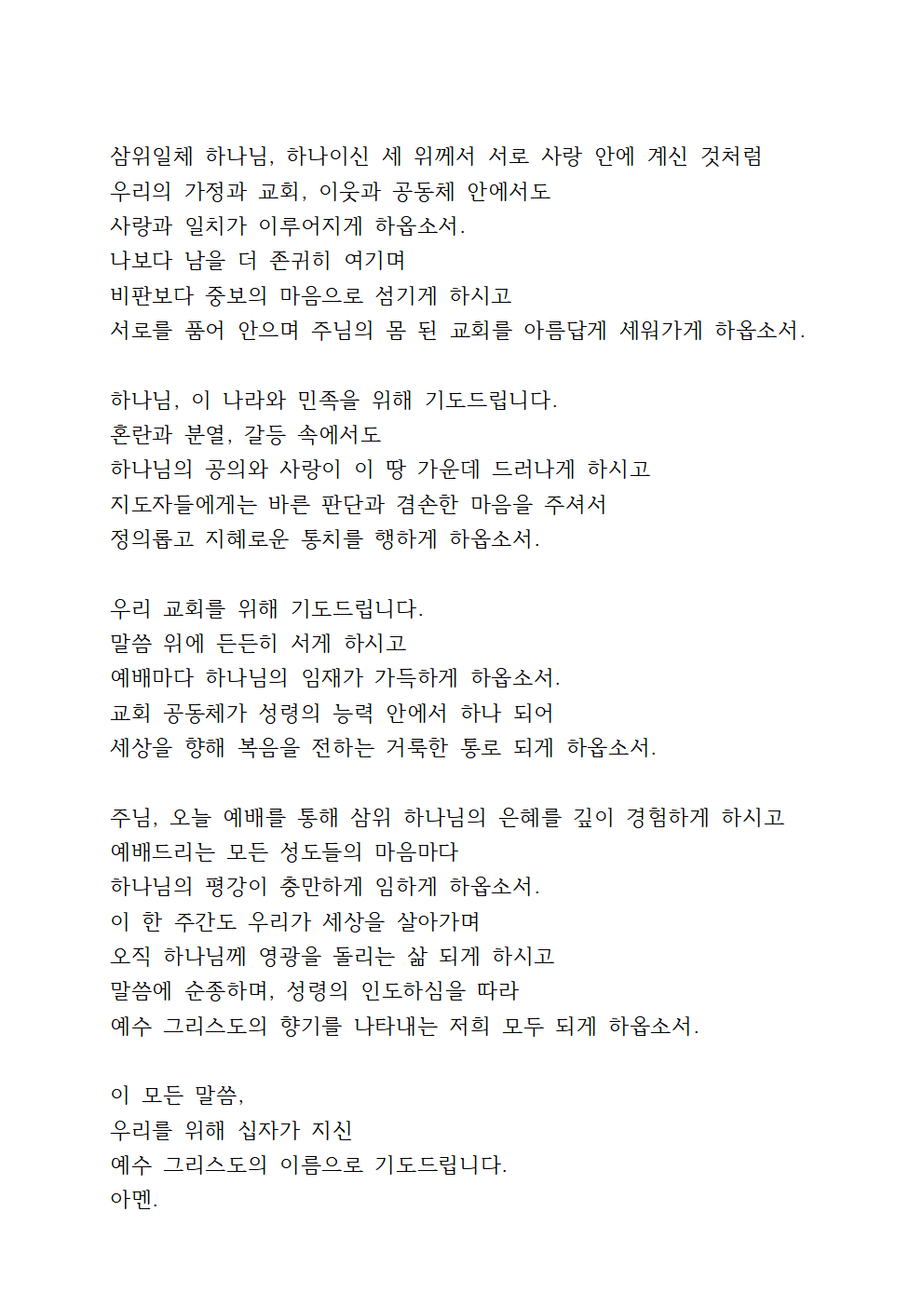 삼위일체 하나님, 하나이신 세 위께서 서로 사랑 안에 계신 것처럼 우리의 가정과 교회, 이웃과 공동체 안에서도 사랑과 일치가 이루어지게 하옵소서. 나보다 남을 더 존귀히 여기며 비판보다 중보의 마음으로 섬기게 하시고 서로를 품어 안으며 주님의 몸 된 교회를 아름답게 세워가게 하옵소서.