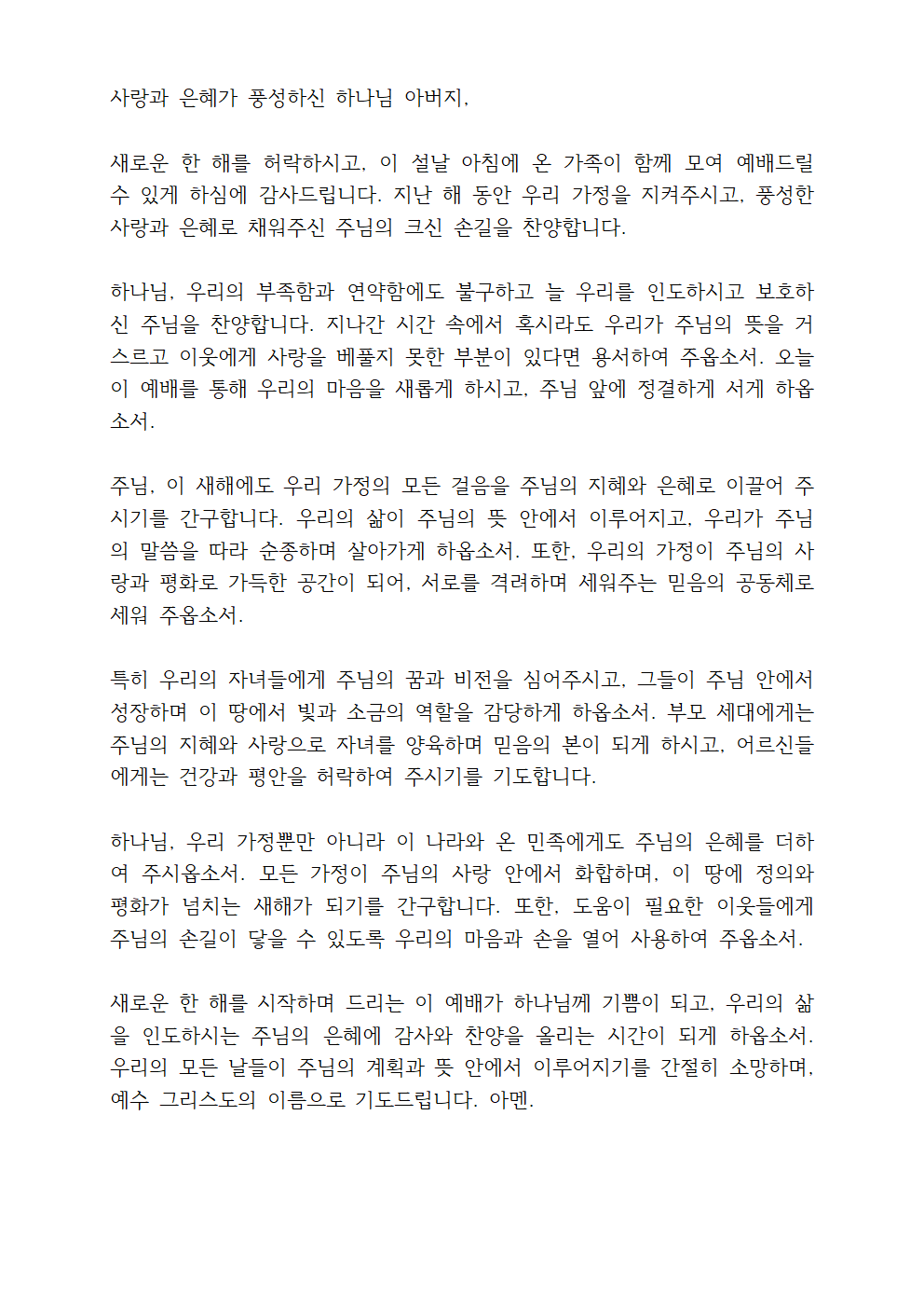 하나님, 우리 가정뿐만 아니라 이 나라와 온 민족에게도 주님의 은혜를 더하여 주시옵소서. 모든 가정이 주님의 사랑 안에서 화합하며, 이 땅에 정의와 평화가 넘치는 새해가 되기를 간구합니다. 또한, 도움이 필요한 이웃들에게 주님의 손길이 닿을 수 있도록 우리의 마음과 손을 열어 사용하여 주옵소서.