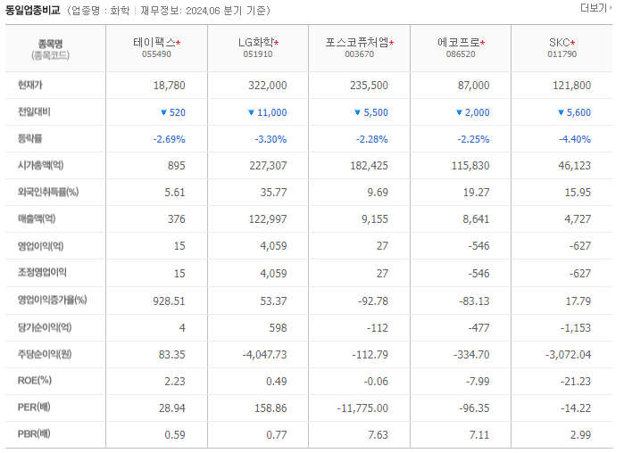 이는 2차 전지 산업의 부진에 따라 주요 사업부인 전자재료 사업부의 2차 전지용 테이프 매출이 감소하였고, 경기악화에 따라 식품포장용 랩 사업부 또한 매출이 감소한 이유로 보입니다.