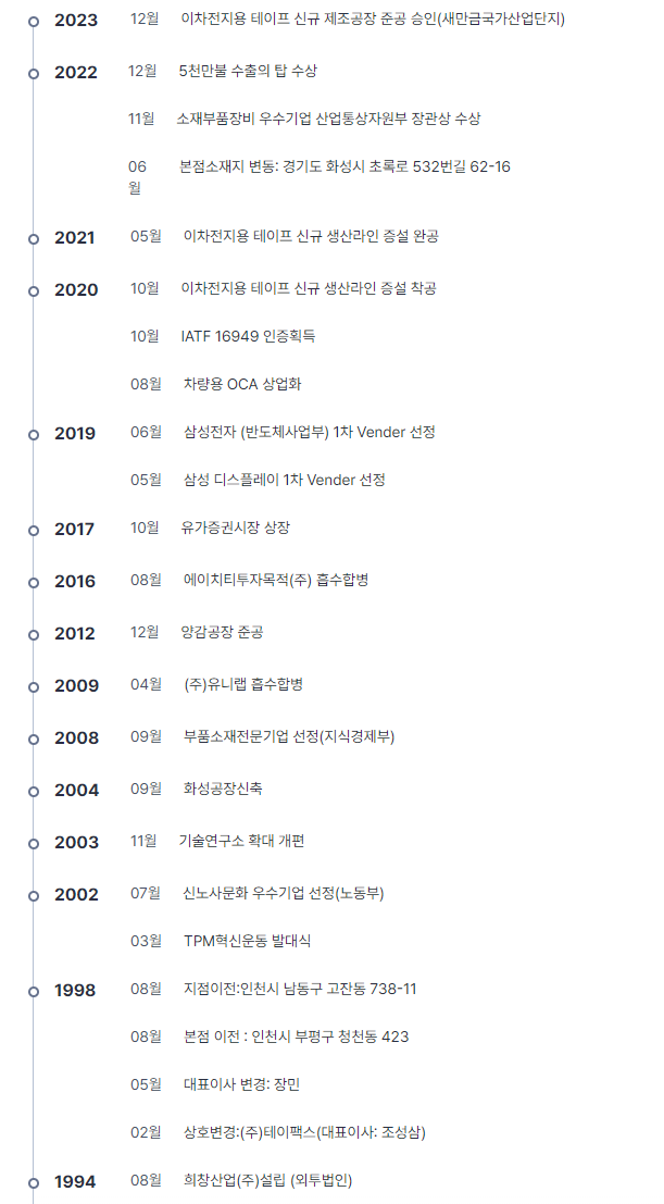 테이팩스는 2차 전지 사업 성장에 따라 새만금 국가산업단지에 신규 공장을 준공(2023년)하였고, 2024년 상반기 초도 매출을 시작으로 전자재료사업부 매출 증대를 기대하고 있습니다.