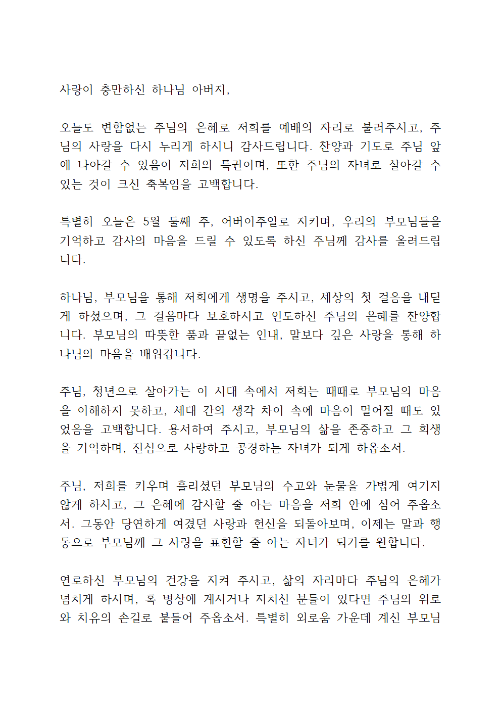 5월 둘째 주일 대표기도문 (어버이 주일)