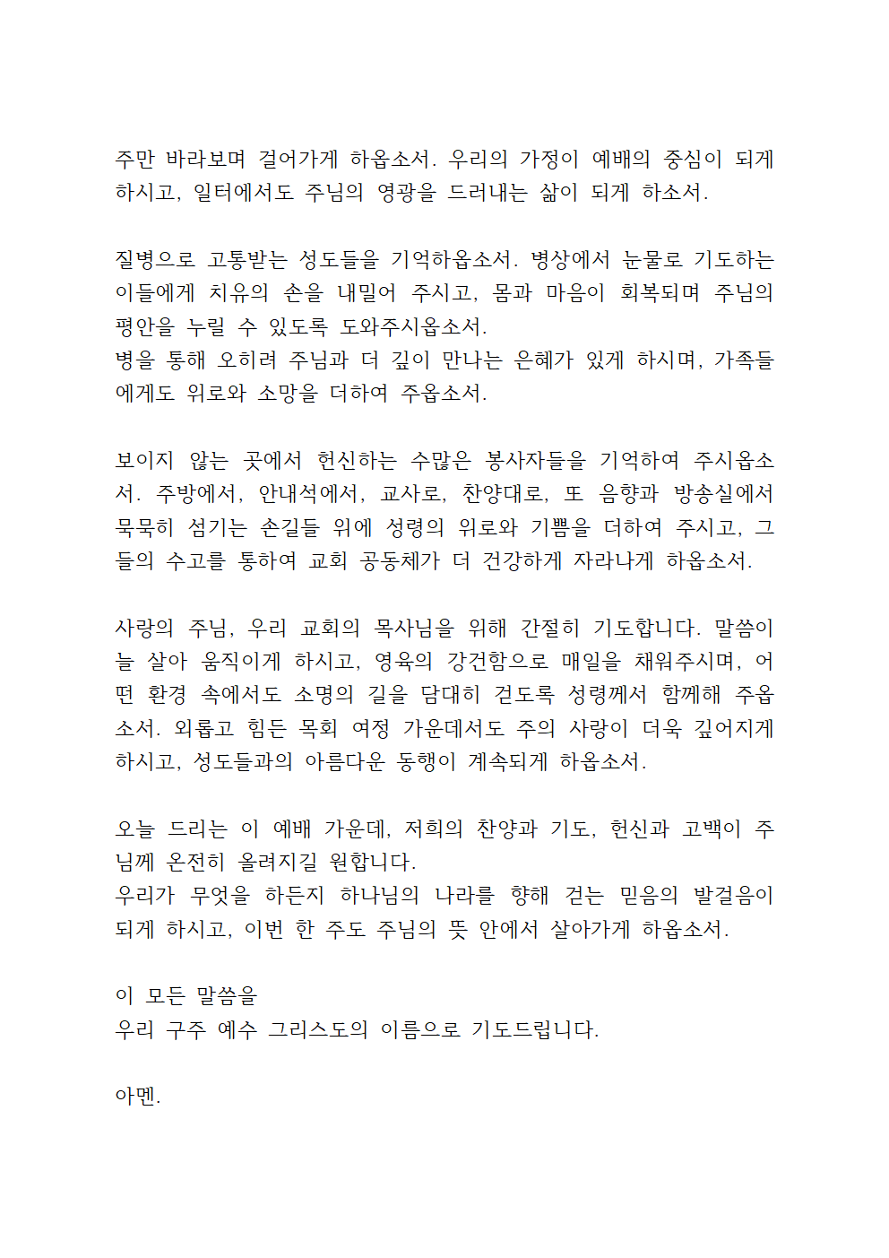 하나님, 특별히 오늘 이 예배를 인도하시는 목사님께 기름 부어 주시고, 선포되는 말씀을 통해 우리의 삶이 변화되게 하옵소서. 봉사자들의 손길 하나하나도 기억하여 주시고, 예배의 모든 순서를 통해 주님의 임재가 가득하게 하소서.