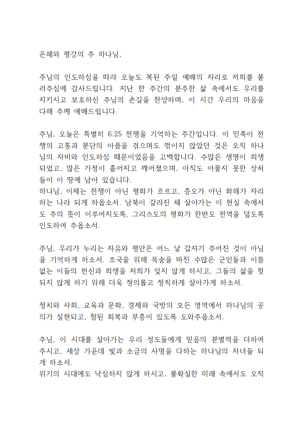 6월 4째주 수요예배 대표기도문