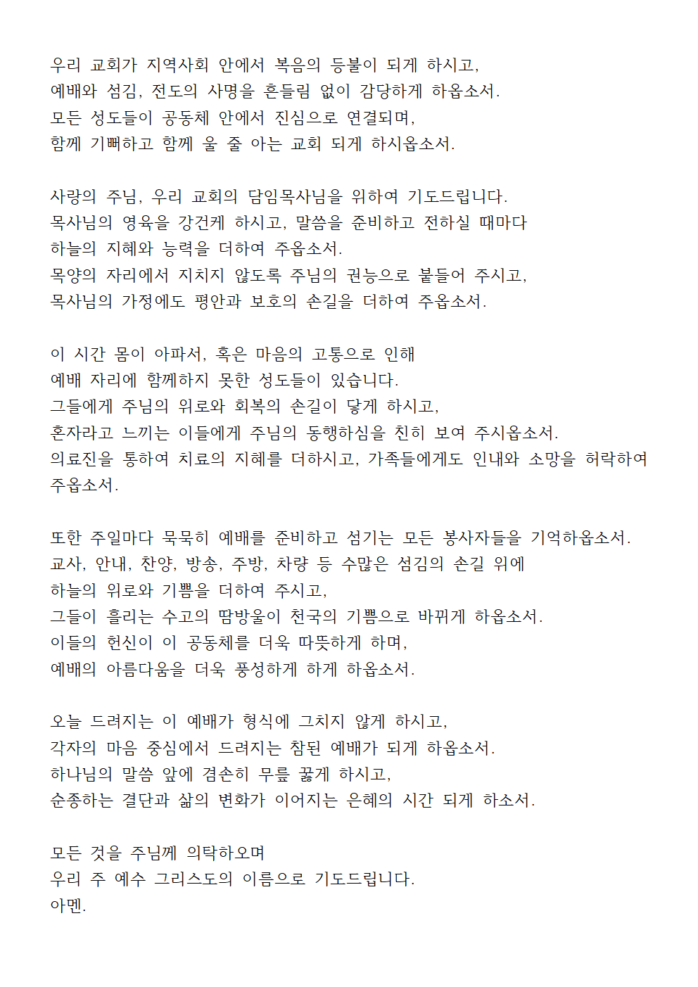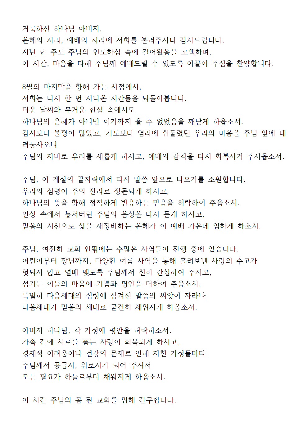 8월 넷째주일낮예배 대표기도문 (한글 파일)