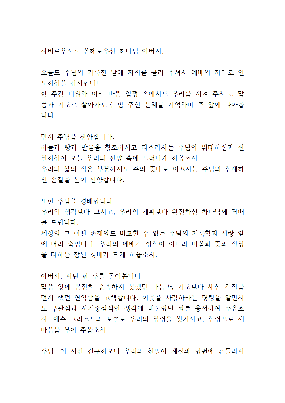 오늘도 저희를 주님의 거룩한 전으로 불러 주시고, 주일예배로 주님을 찬양하게 하시니 감사드립니다. 지난 한 주간도 폭염과 여러 상황 속에서 저희의 발걸음을 지켜 주시고, 믿음을 잃지 않도록 인도하신 주님의 손길을 찬양합니다. 이 시간 우리의 마음이 오직 주님만 바라보게 하시고, 예배 속에서 주님의 평안과 능력을 깊이 경험하게 하옵소서.
