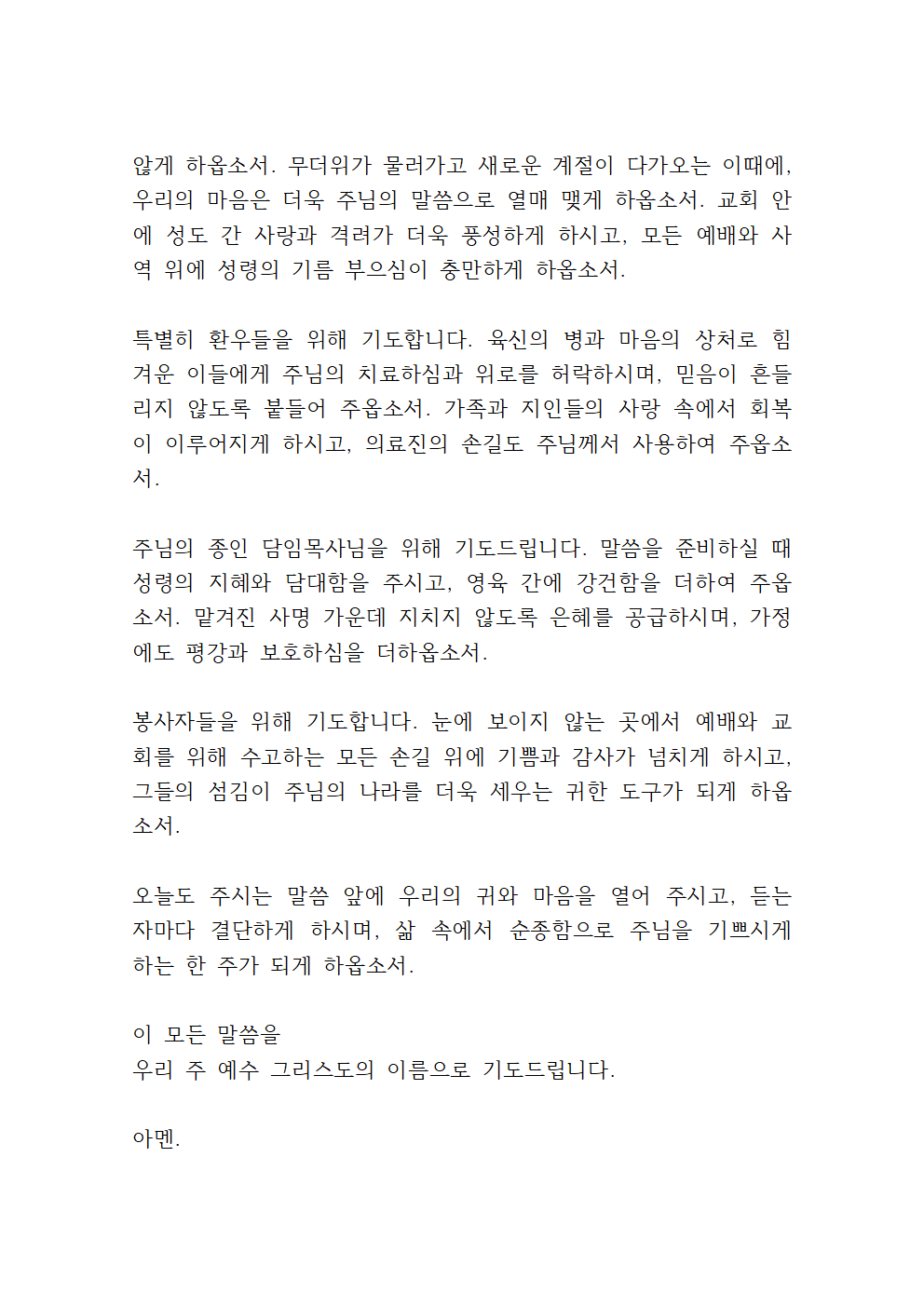 사랑의 주님, 더위와 삶의 무게로 지친 성도들을 위로하시고, 병상에 있는 환우들에게는 치유의 손길을, 경제적으로 어려움에 처한 가정에는 공급하시는 은혜를, 외롭고 낙심한 심령에는 하늘의 위로와 소망을 부어 주옵소서. 국내외에서 복음을 전하는 선교사님들과 그 가정을 지켜 주시고, 그들의 사역과 생활에 필요한 모든 것을 넉넉히 채워 주옵소서.