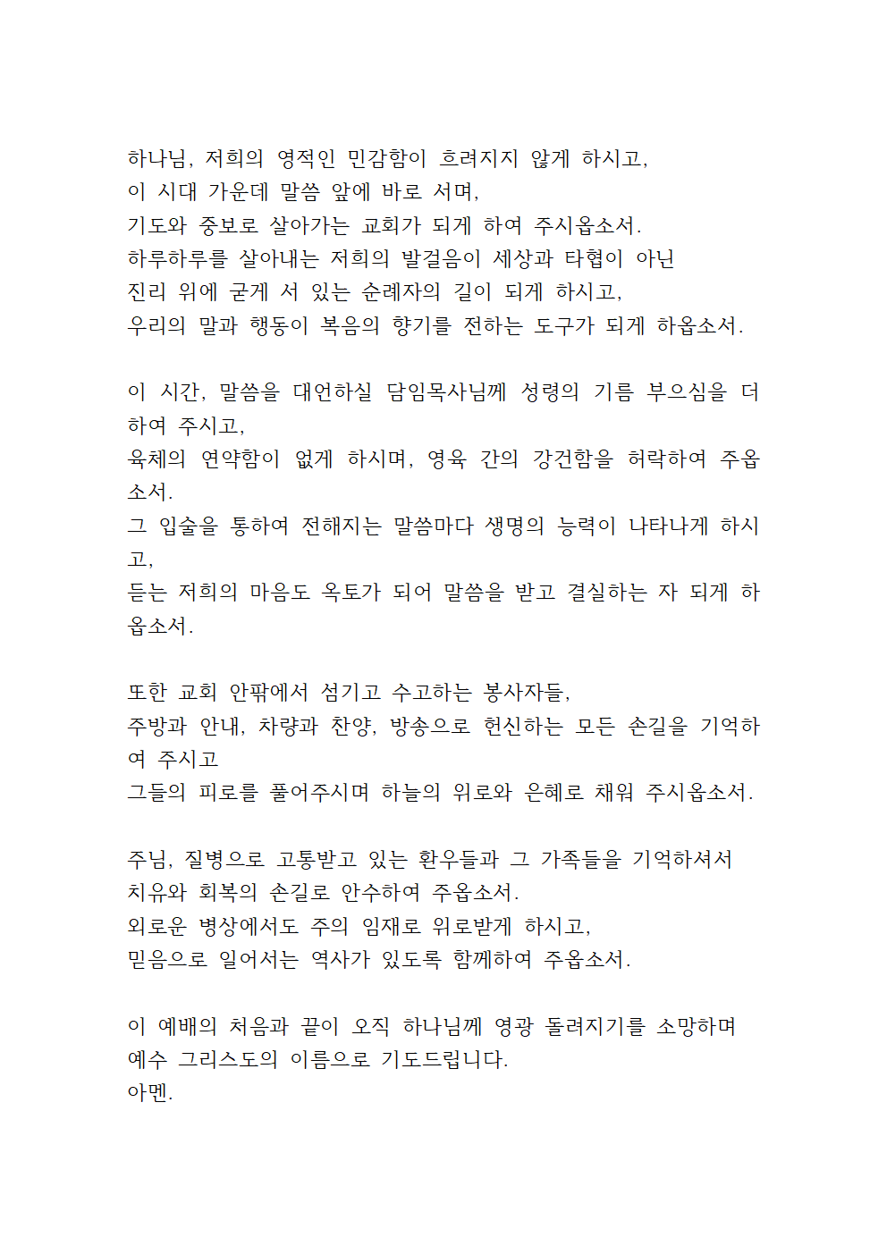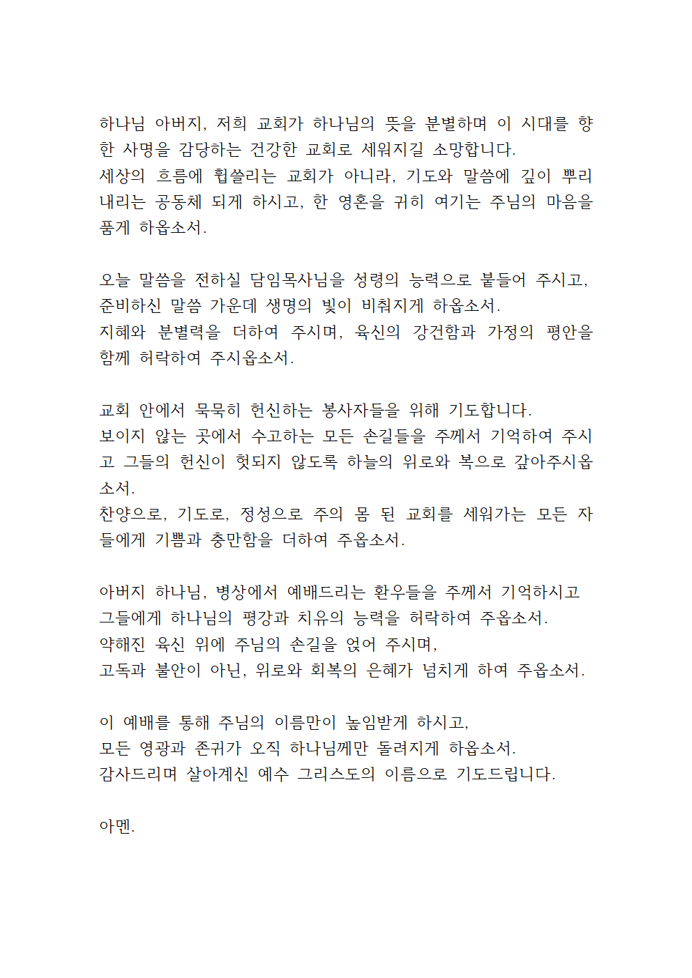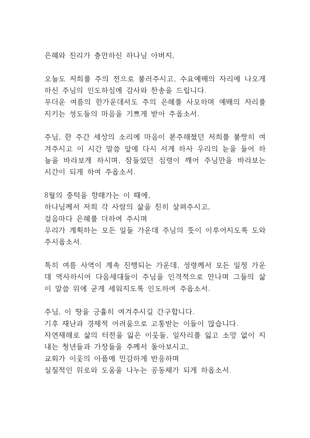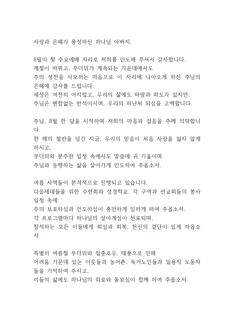 이번 글에서는 8월 수요예배 대표기도문 (한글 파일)을 안내해 드리겠습니다.