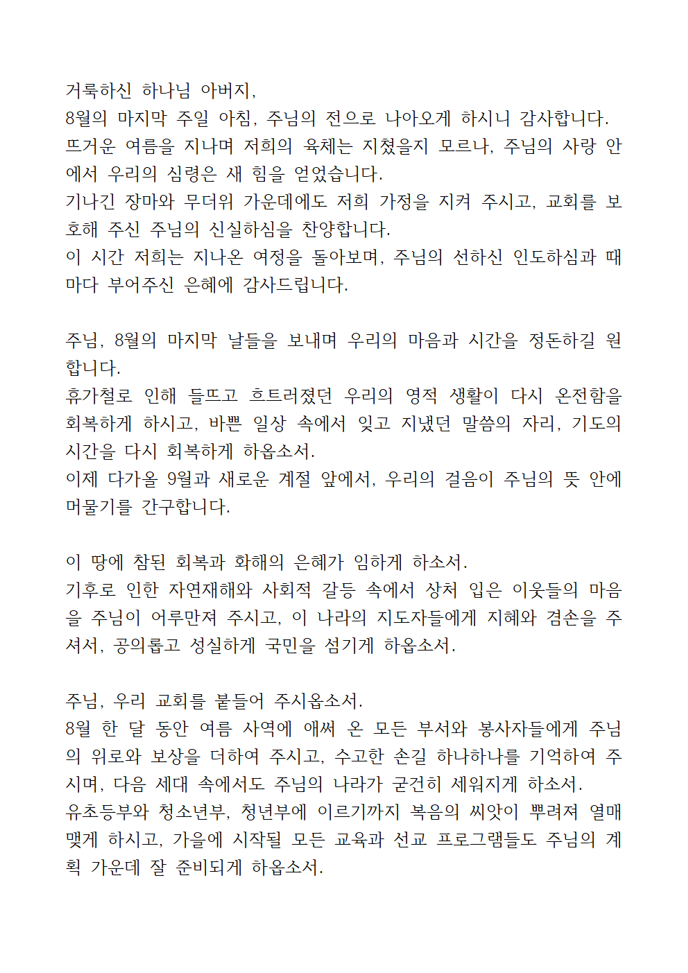 이번 글에서는 8월 5주 대표기도문 (첨부 파일)을 안내해 드리겠습니다.