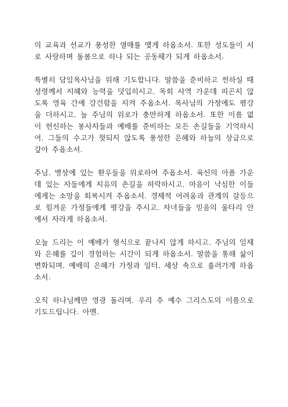 주님, 교회를 주님의 손에 맡깁니다. 이 시대에 흔들림 없는 믿음의 공동체로 세워 주시고, 말씀과 기도로 깨어 있는 교회가 되게 하옵소서. 담임목사님과 모든 사역자들에게 성령의 충만함을 더하시고, 말씀을 선포할 때마다 생명의 능력이 나타나게 하옵소서. 또한 교회를 위해 묵묵히 수고하는 봉사자들을 기억하셔서 그들의 손길이 주님의 기쁨이 되게 하시고, 삶 속에서도 은혜와 평강을 누리게 하옵소서.