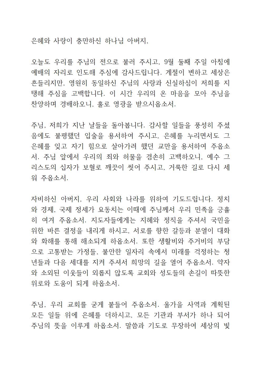 9월 주일예배 대표기도문 본문